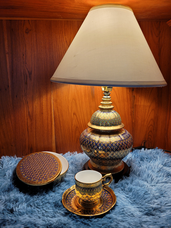 Apart from the popular Lai Nam Thong design , MS Benjarong is capable of producing Benjarong in a variety of Thai adaptations using different painting techniques, for instance, the mixture of Benjarong-styled pattern and the gold patterned with protrusion technique on matt surface objects. Luster oil can be applied to some items before painting to add a glossy look